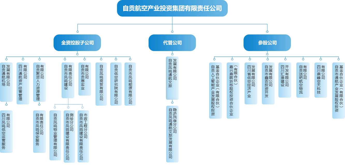 自贡taptap集团有限责任公司(以下简称 自贡taptap )成立于2018年2月,是由自贡航空产业园区管委会出资的国有集团公司。公司位于自贡市贡井区自贡航空产业园内,下辖自贡通航机场发展有限公司、自贡市凤鸣建设有限责任公司、四川通航资产经营管理有限公司、自贡聚贤人力资源管理有限公司、自贡凤鸣商贸有限公司、自贡凤鸣物业管理有限公司、自贡市凤鸣保安服务有限责任公司、四川凤鸣低空运营服务有限公司等11家全资子公司,对外投资企业8家,代管自贡凤鸣通航文旅发展有限公司。