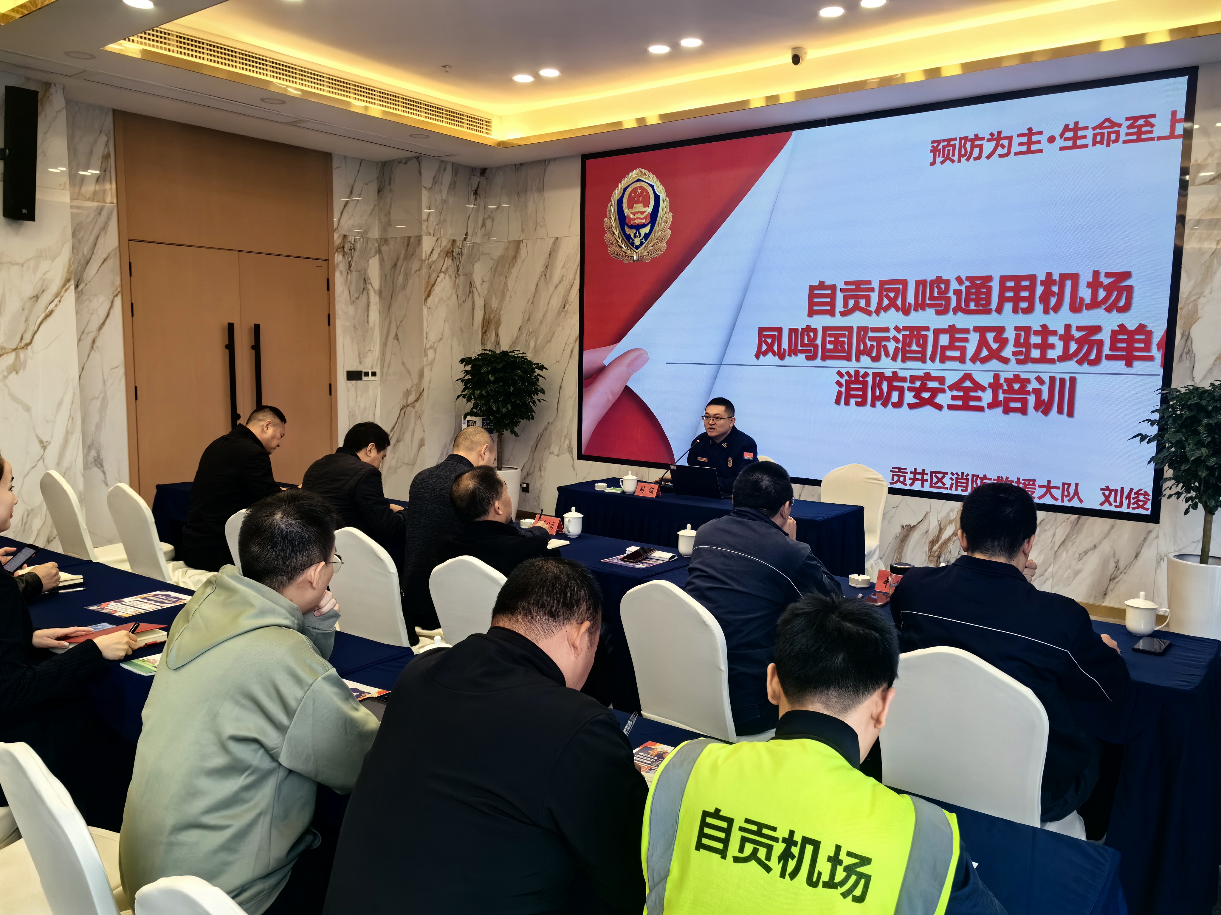 为进一步提高自贡凤鸣通用机场、凤鸣国际酒店及驻场单位员工消防安全意识,加强公司火灾隐患安全防控工作,11月13日上午,贡井区消防救援大队副大队长刘俊到凤鸣国际酒店开展消防安全培训工作。