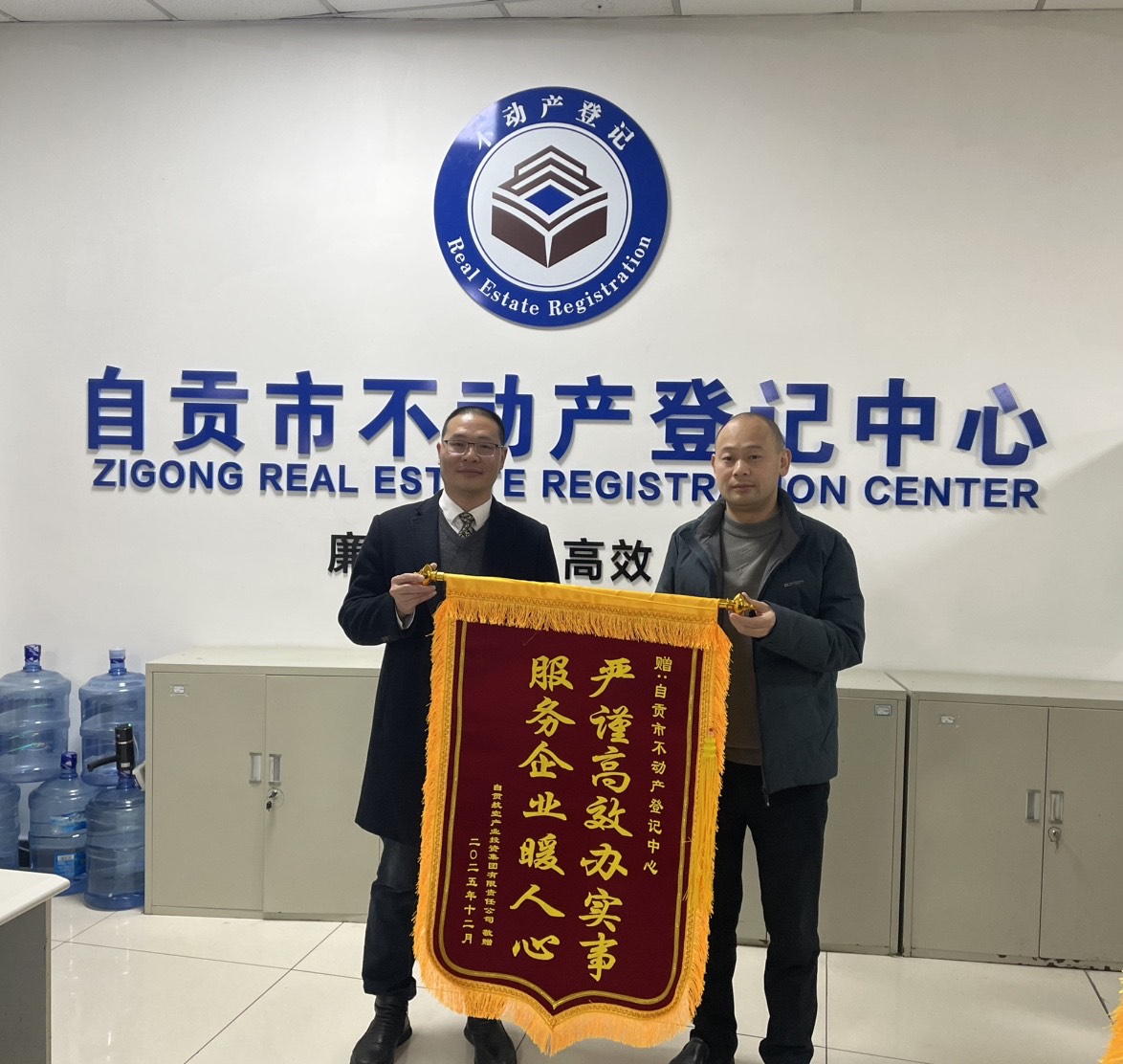 近日,自贡taptap集团将印刻着“严谨高效办实事 服务企业暖人心”“登记高效 服务贴心”的锦旗送至自贡市不动产登记中心,以感谢中心在项目产权证办理过程中提供的精准指导与高效服务。