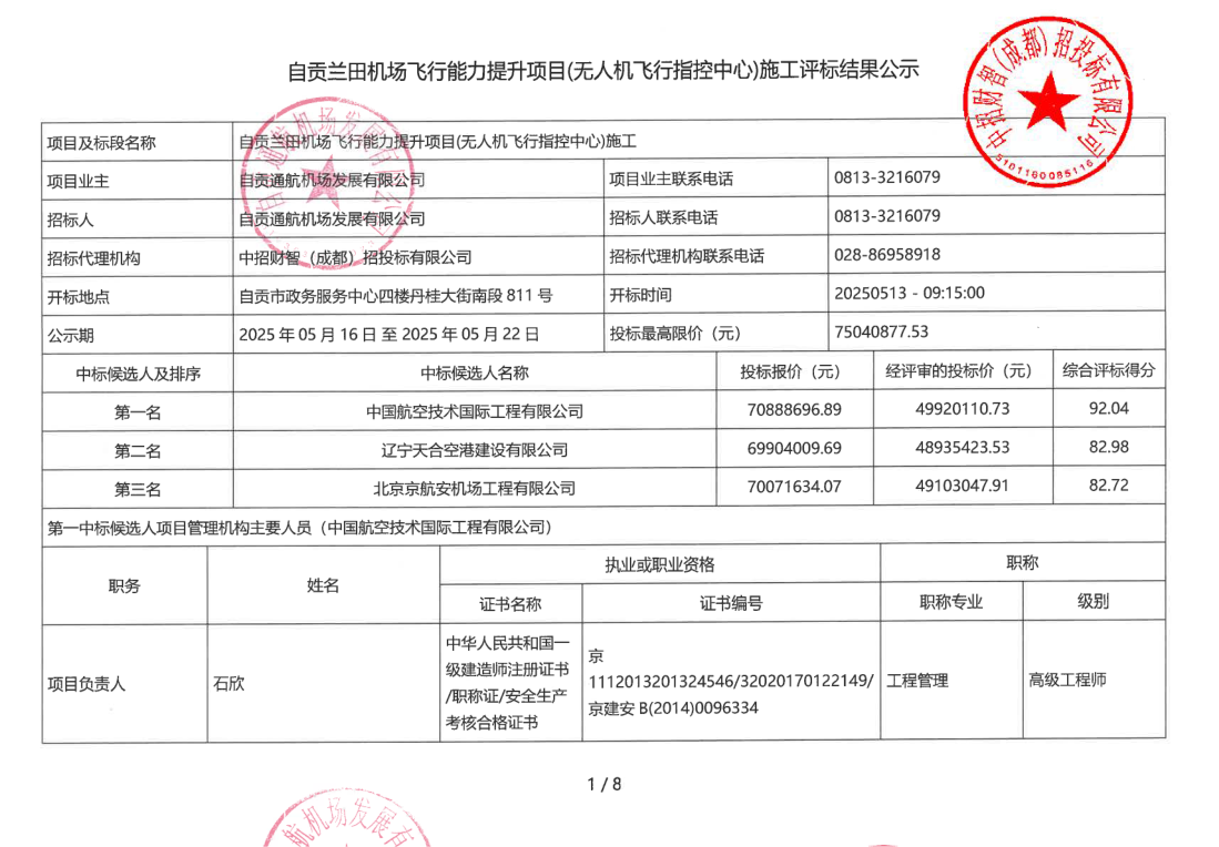 自贡兰田机场飞行能力提升项目(无人机飞行指控中心)施工评标结果公告